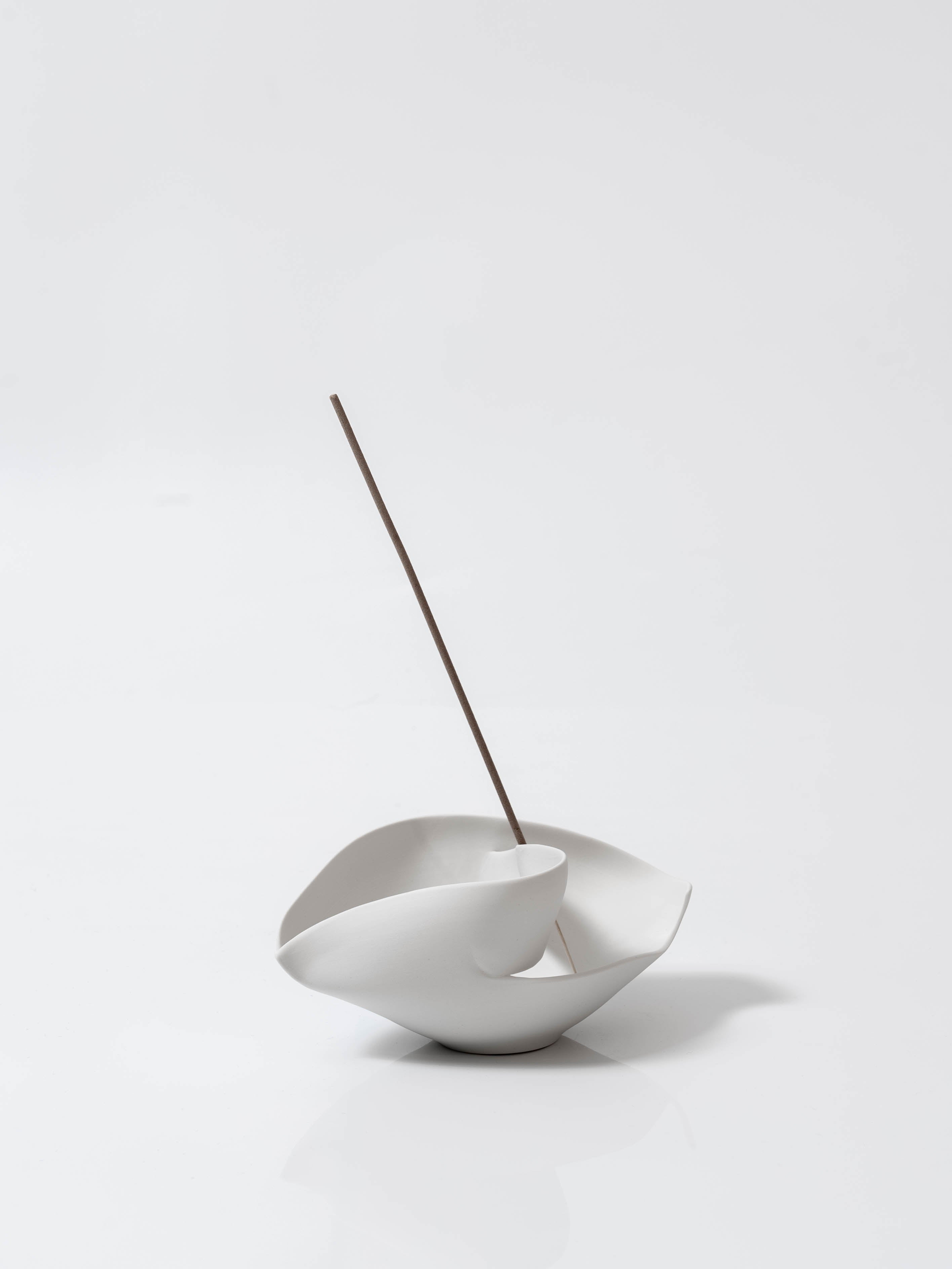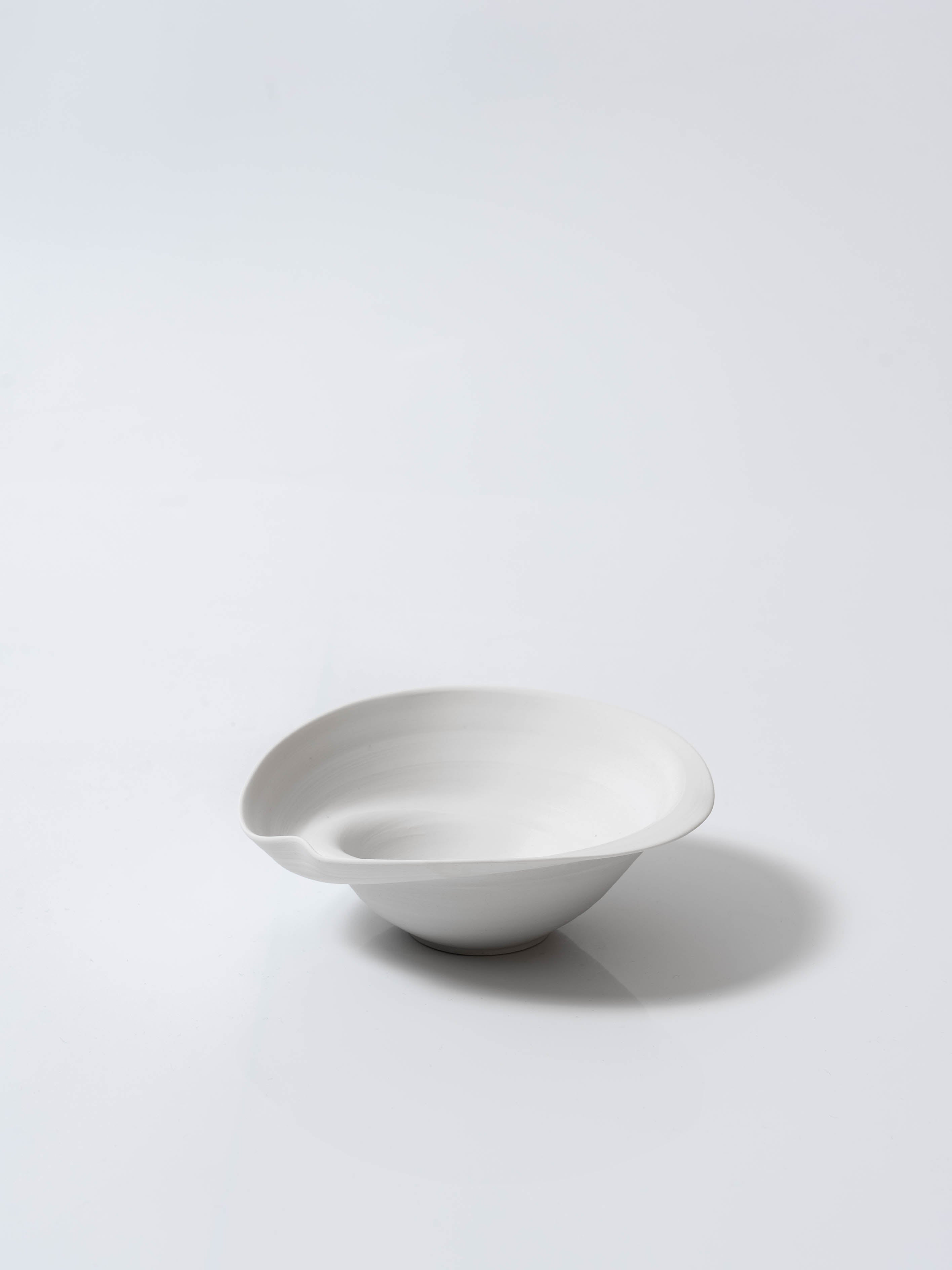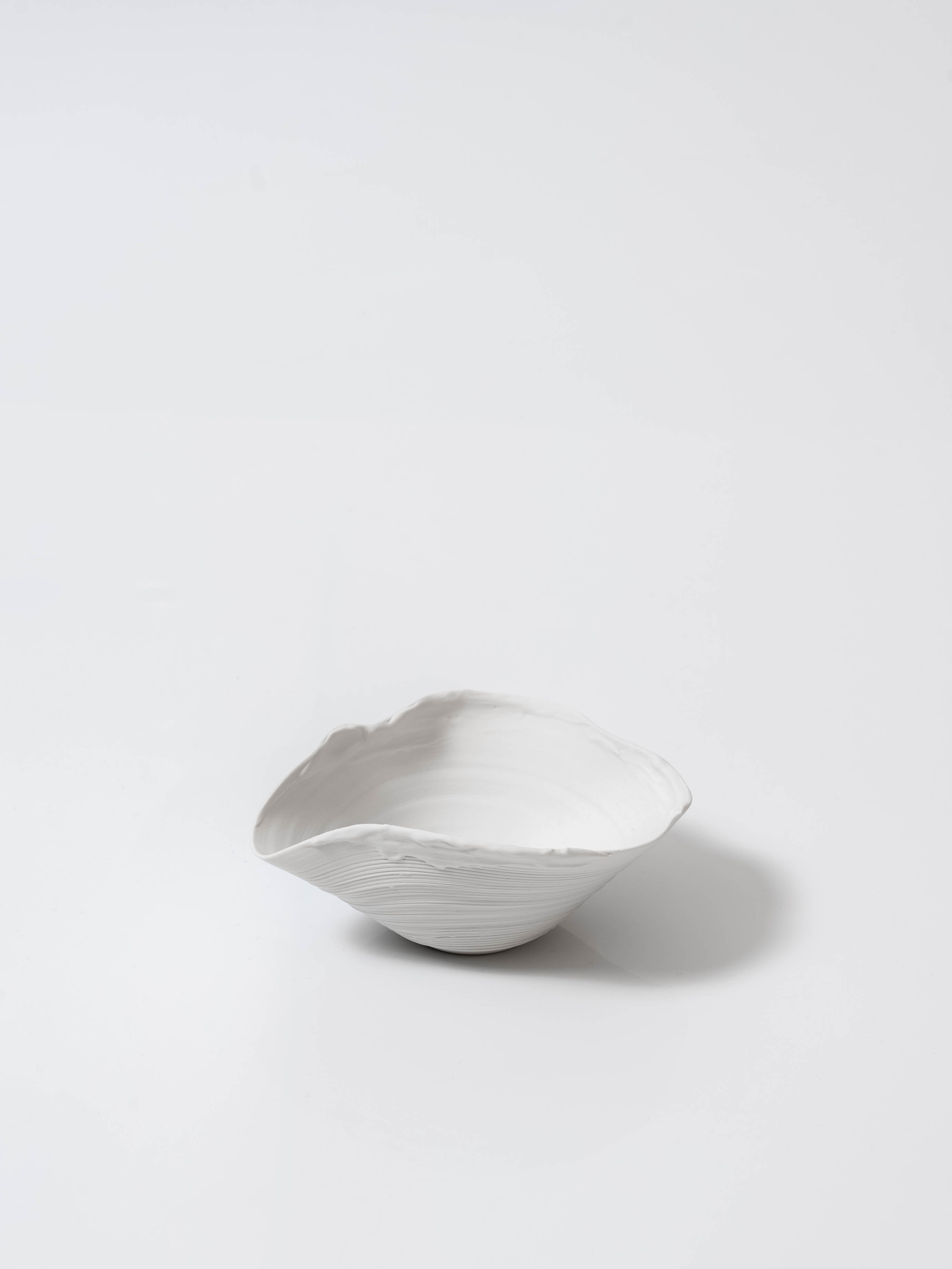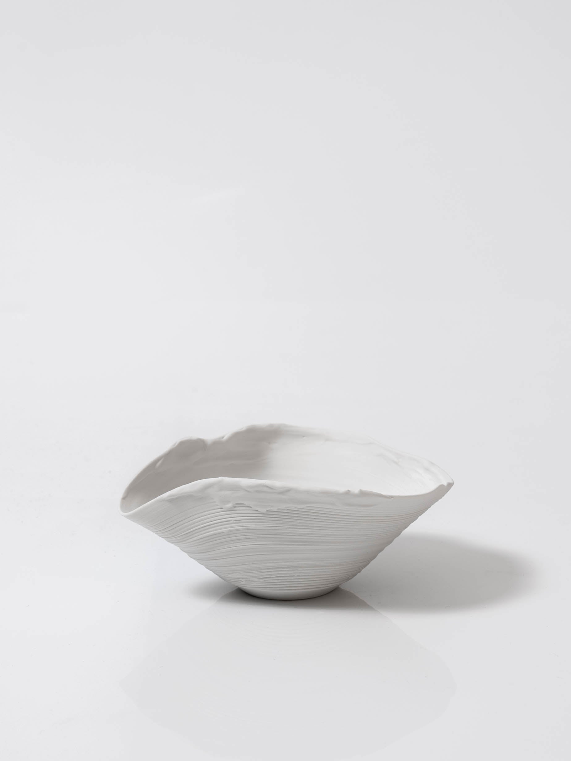 平安時代、宮中の膳や神前の祭壇にひそやかに置かれていた素焼きの器「瓦笥(かはらけ)」。釉薬を施さずに土の肌をそのまま見せるこの器は、日常と神事の間に在る器として平安時代の宮中や神事の場に静かに佇んでいました。『源氏物語』をはじめとする古典文学にもその名を留め、平安貴族の食卓における静かな気配として、また神を迎える祭祀の具として、人と神の間を取り持つ象徴的な存在でありました。特に平安時代において瓦笥は、御神酒を捧げる盃や三方の上に神饌を供える器として用いられており、素焼きという素材の選択にも、余計な美飾を廃してただ清らかさのみを際立たせる思想が宿っています。その瓦笥に着想を得て、現代の生活空間と美意識に合わせて生まれ変わらせたセラミックアートとなっています。磁器の持つ繊細で美しい輝き、澄み切った白、そして彫刻的・構築的な意匠。それに日本の伝統美を掛け合わせ、ほのかに王朝の香りが漂う現代の瓦笥として再解釈しました。