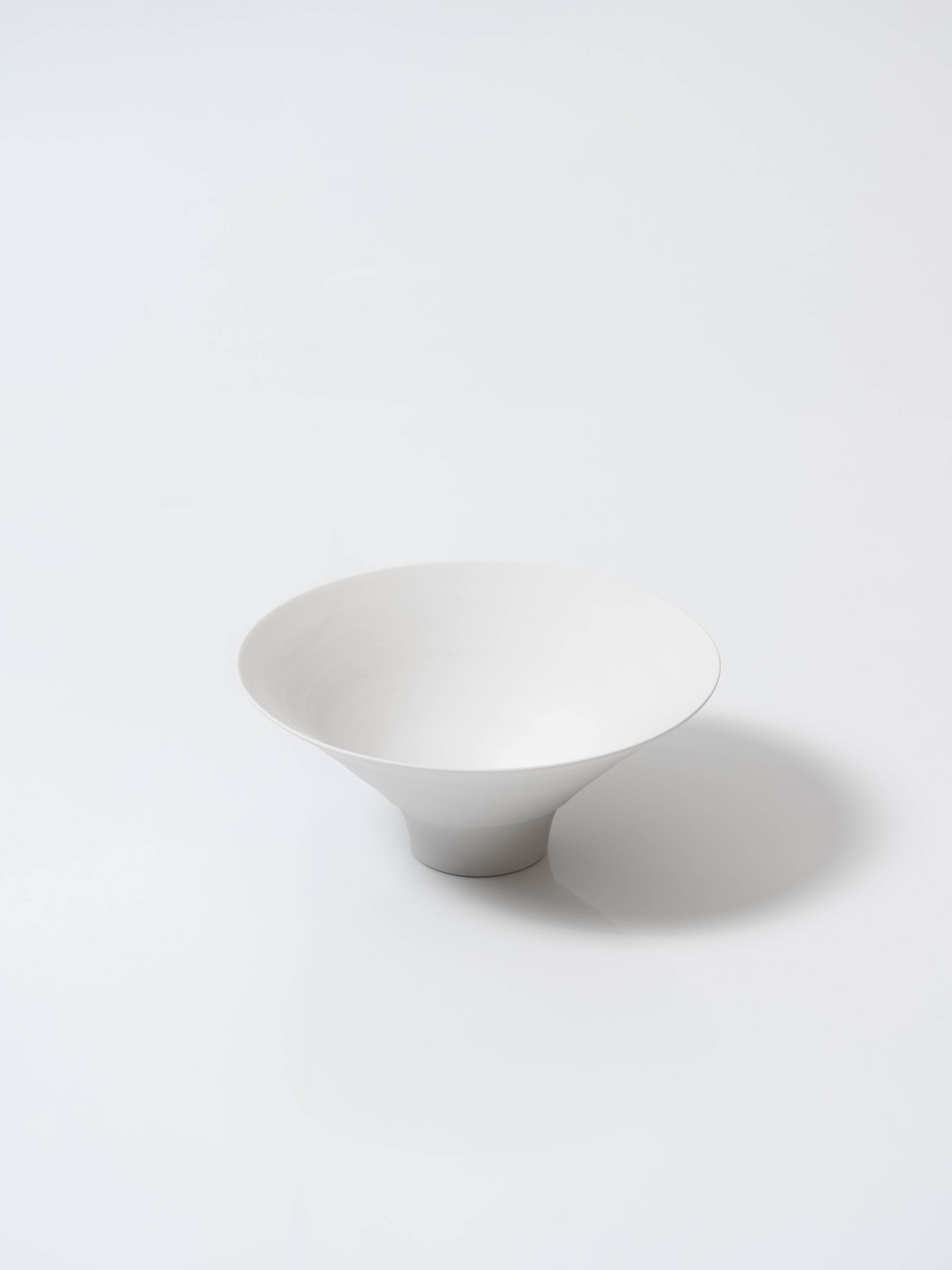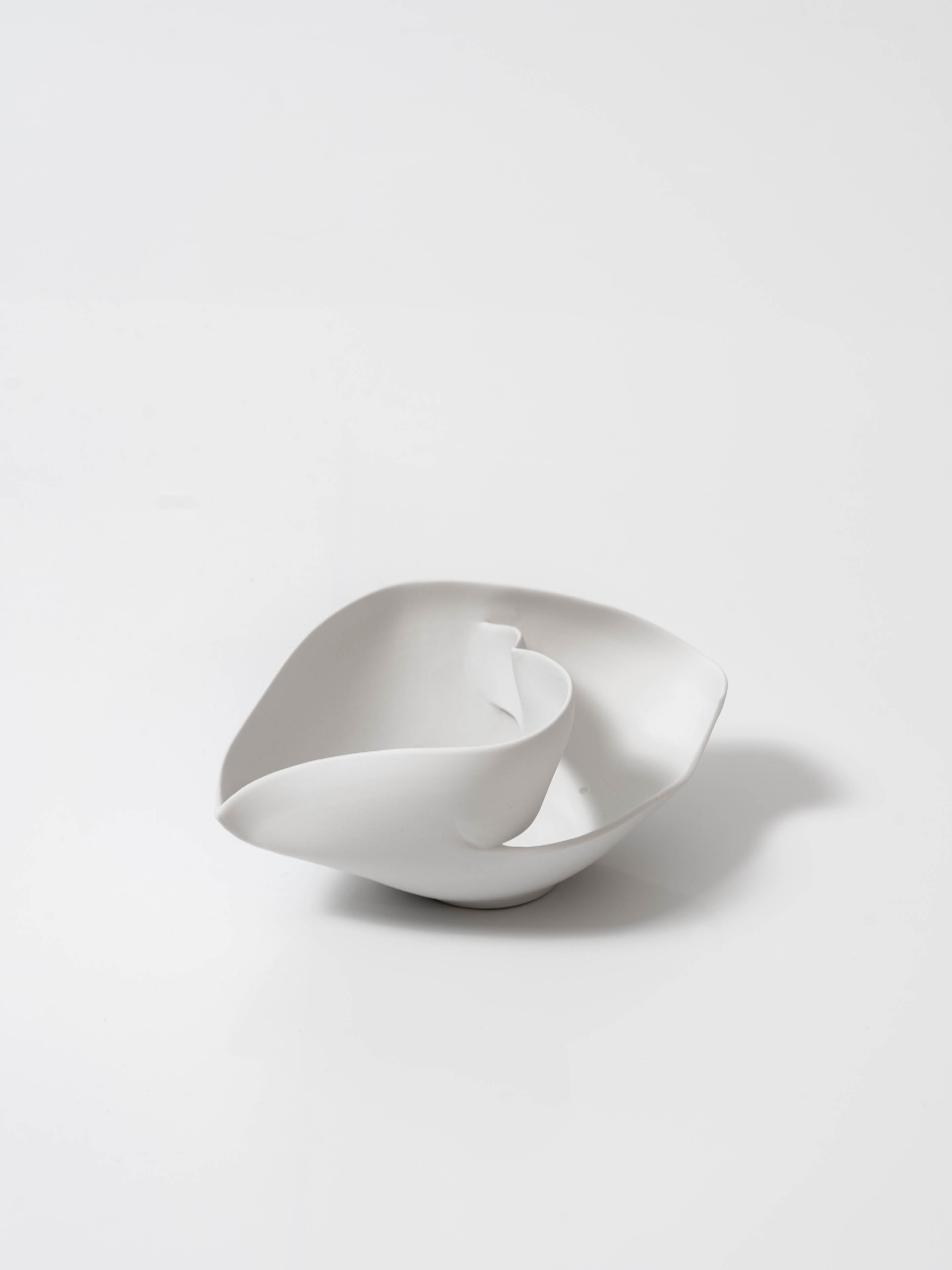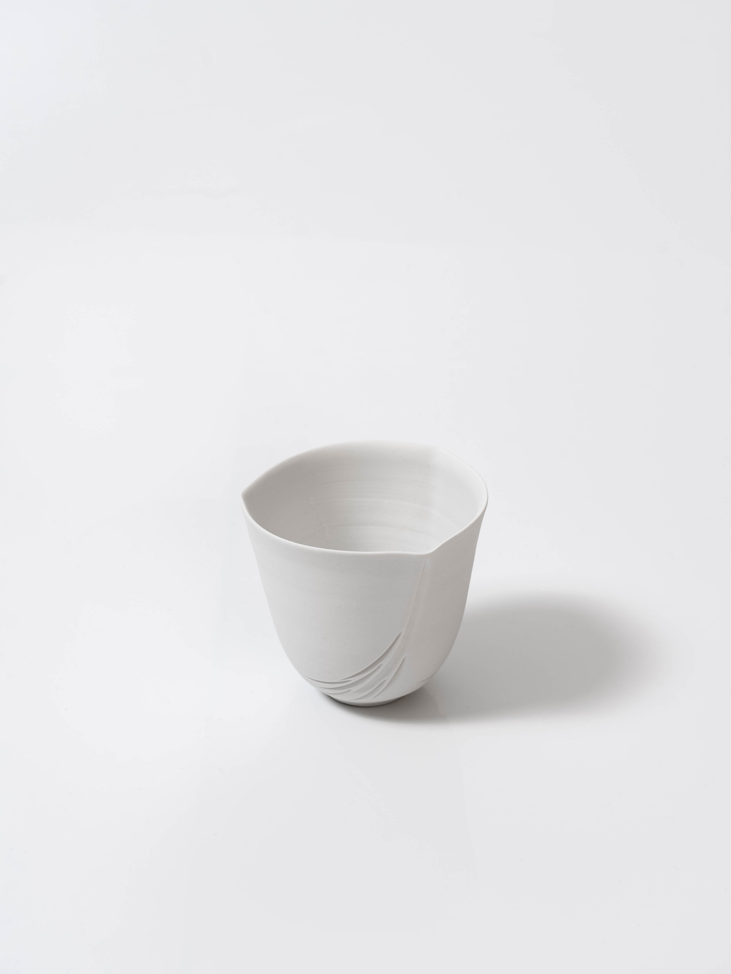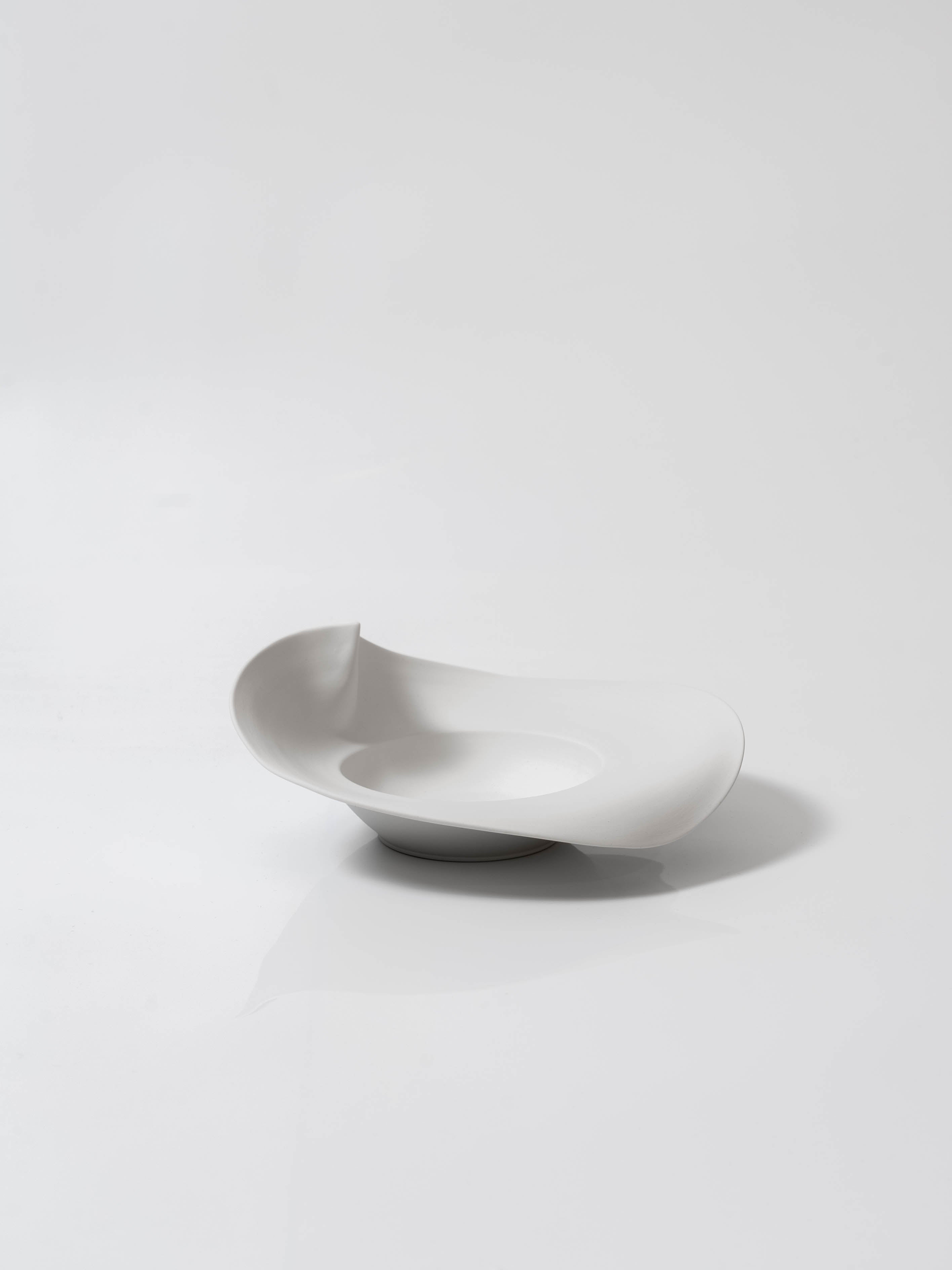 平安時代、宮中の膳や神前の祭壇にひそやかに置かれていた素焼きの器「瓦笥(かはらけ)」。釉薬を施さずに土の肌をそのまま見せるこの器は、日常と神事の間に在る器として平安時代の宮中や神事の場に静かに佇んでいました。『源氏物語』をはじめとする古典文学にもその名を留め、平安貴族の食卓における静かな気配として、また神を迎える祭祀の具として、人と神の間を取り持つ象徴的な存在でありました。特に平安時代において瓦笥は、御神酒を捧げる盃や三方の上に神饌を供える器として用いられており、素焼きという素材の選択にも、余計な美飾を廃してただ清らかさのみを際立たせる思想が宿っています。その瓦笥に着想を得て、現代の生活空間と美意識に合わせて生まれ変わらせたセラミックアートとなっています。磁器の持つ繊細で美しい輝き、澄み切った白、そして彫刻的・構築的な意匠。それに日本の伝統美を掛け合わせ、ほのかに王朝の香りが漂う現代の瓦笥として再解釈しました。