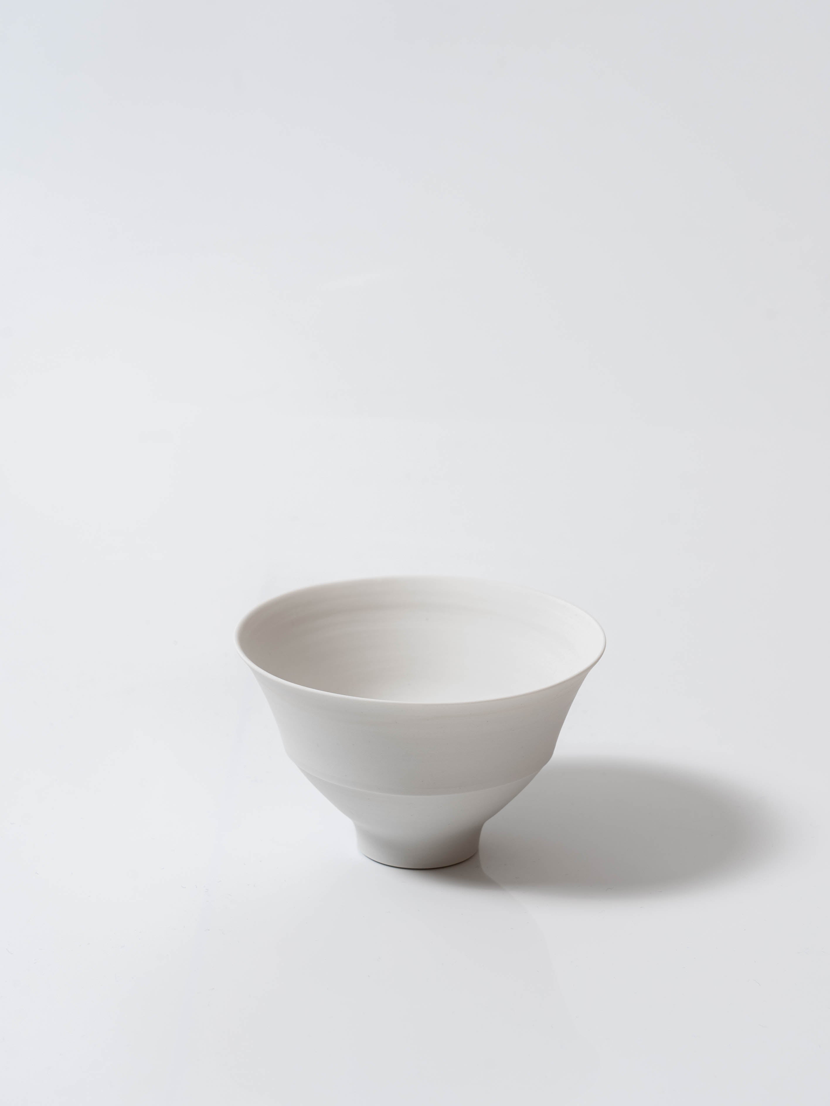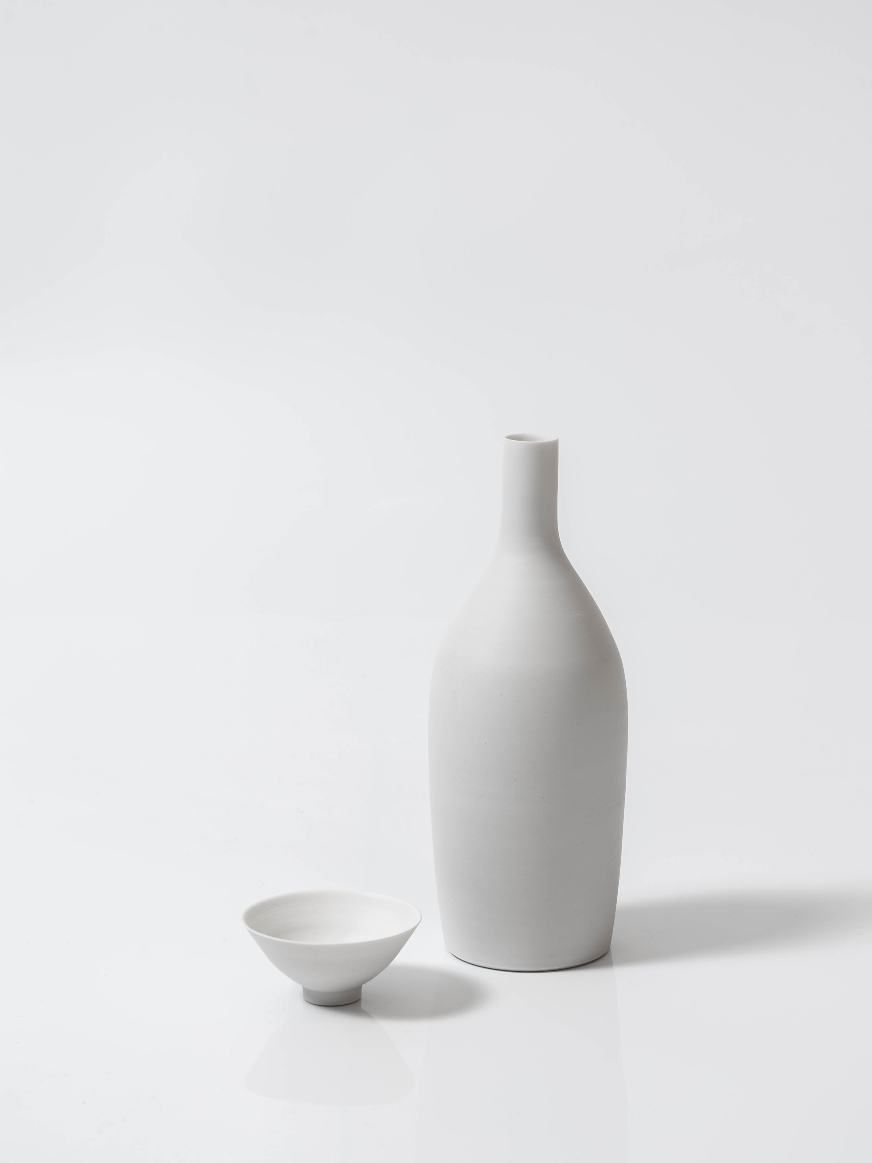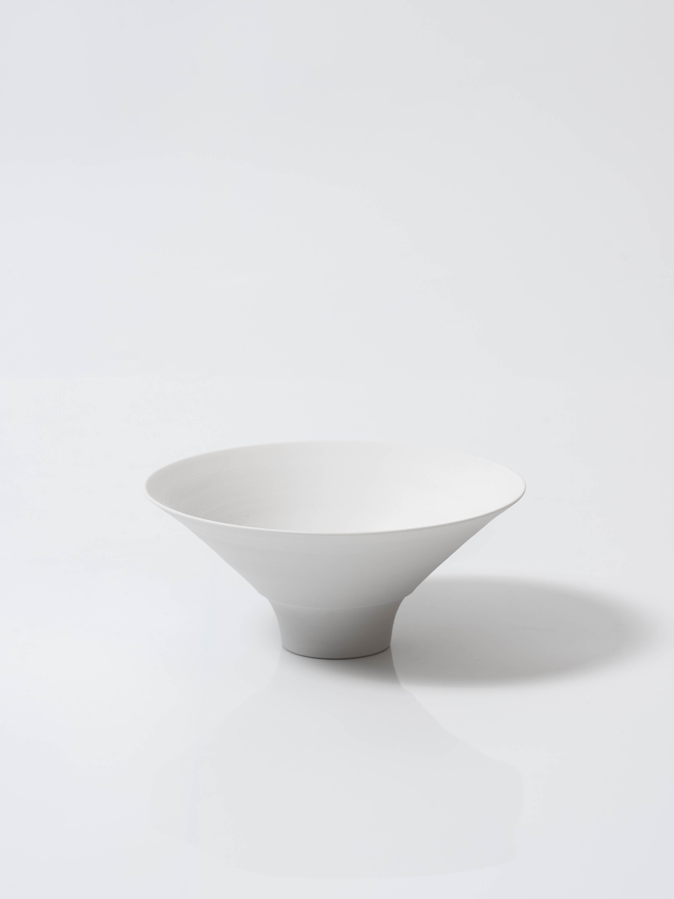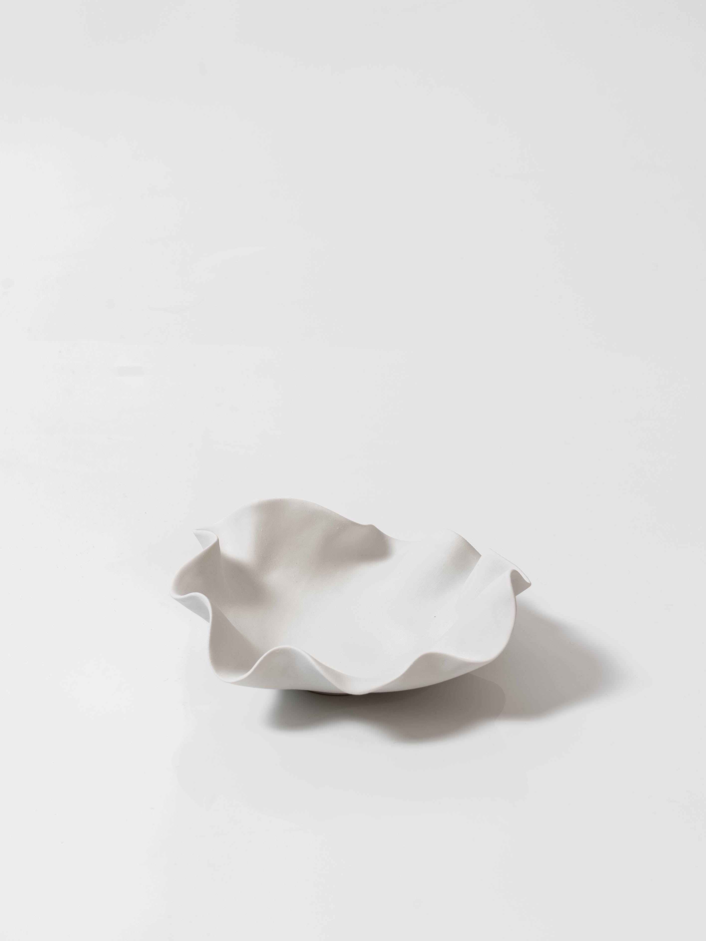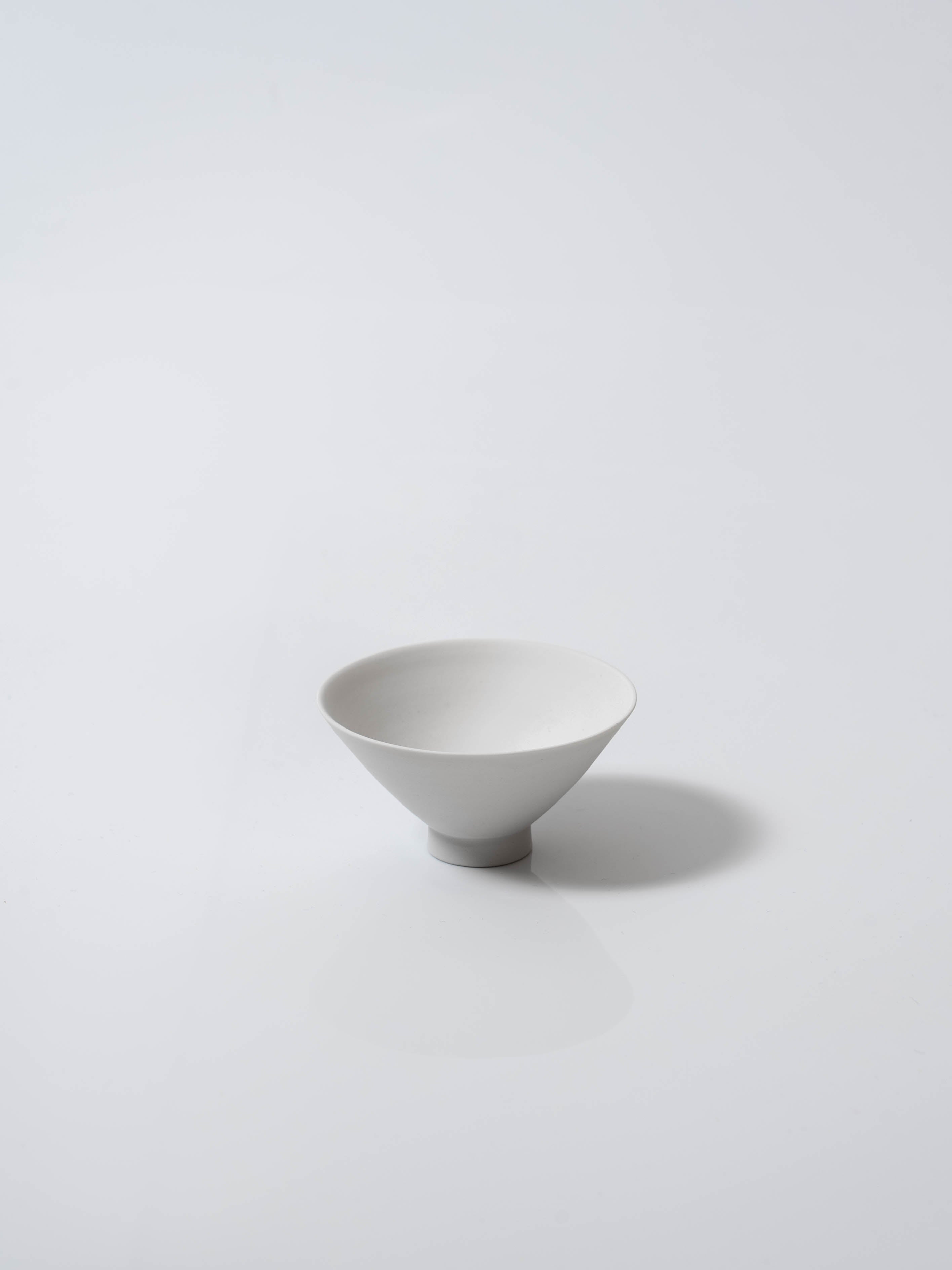 平安時代、宮中の膳や神前の祭壇にひそやかに置かれていた素焼きの器「瓦笥(かはらけ)」。釉薬を施さずに土の肌をそのまま見せるこの器は、日常と神事の間に在る器として平安時代の宮中や神事の場に静かに佇んでいました。『源氏物語』をはじめとする古典文学にもその名を留め、平安貴族の食卓における静かな気配として、また神を迎える祭祀の具として、人と神の間を取り持つ象徴的な存在でありました。特に平安時代において瓦笥は、御神酒を捧げる盃や三方の上に神饌を供える器として用いられており、素焼きという素材の選択にも、余計な美飾を廃してただ清らかさのみを際立たせる思想が宿っています。その瓦笥に着想を得て、現代の生活空間と美意識に合わせて生まれ変わらせたセラミックアートとなっています。磁器の持つ繊細で美しい輝き、澄み切った白、そして彫刻的・構築的な意匠。それに日本の伝統美を掛け合わせ、ほのかに王朝の香りが漂う現代の瓦笥として再解釈しました。