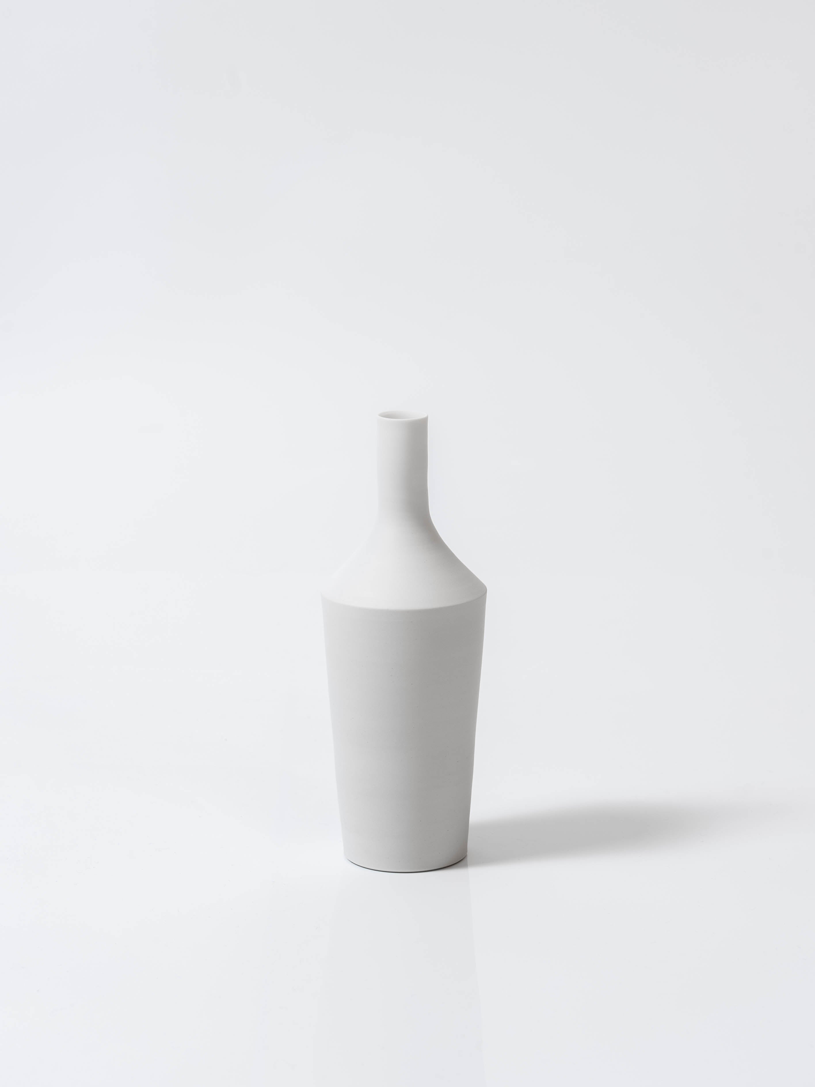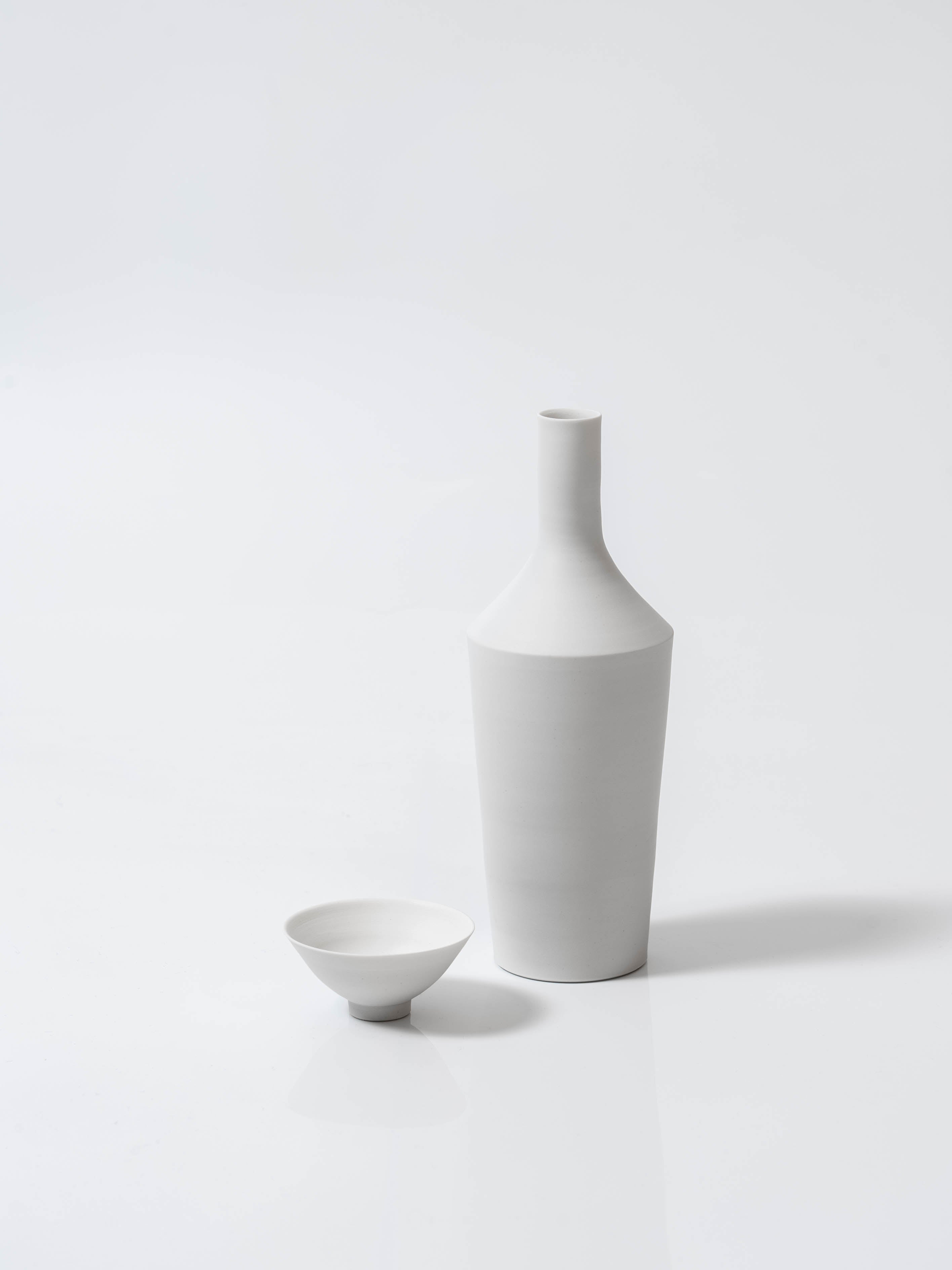 本作は形状の異なる二つの徳利のうちの「稜(りょう)」となっています。胴部に施されたわずかな角度がモダンな表情を生み出し、建築的な美しさを宿す。上部のくびれとの対比が印象的で、どの角度から眺めても凛とした存在感を放ち、注がれる酒の輝きまでもが器の美に溶け込んでいく。⽩磁のもつ冷ややかな光沢は使い⼿の⼼を静め、酒に向き合うひとときを豊かに満たす。それはまさに、宝を納める器にふさわしい気品と静謐を湛えた存在です。