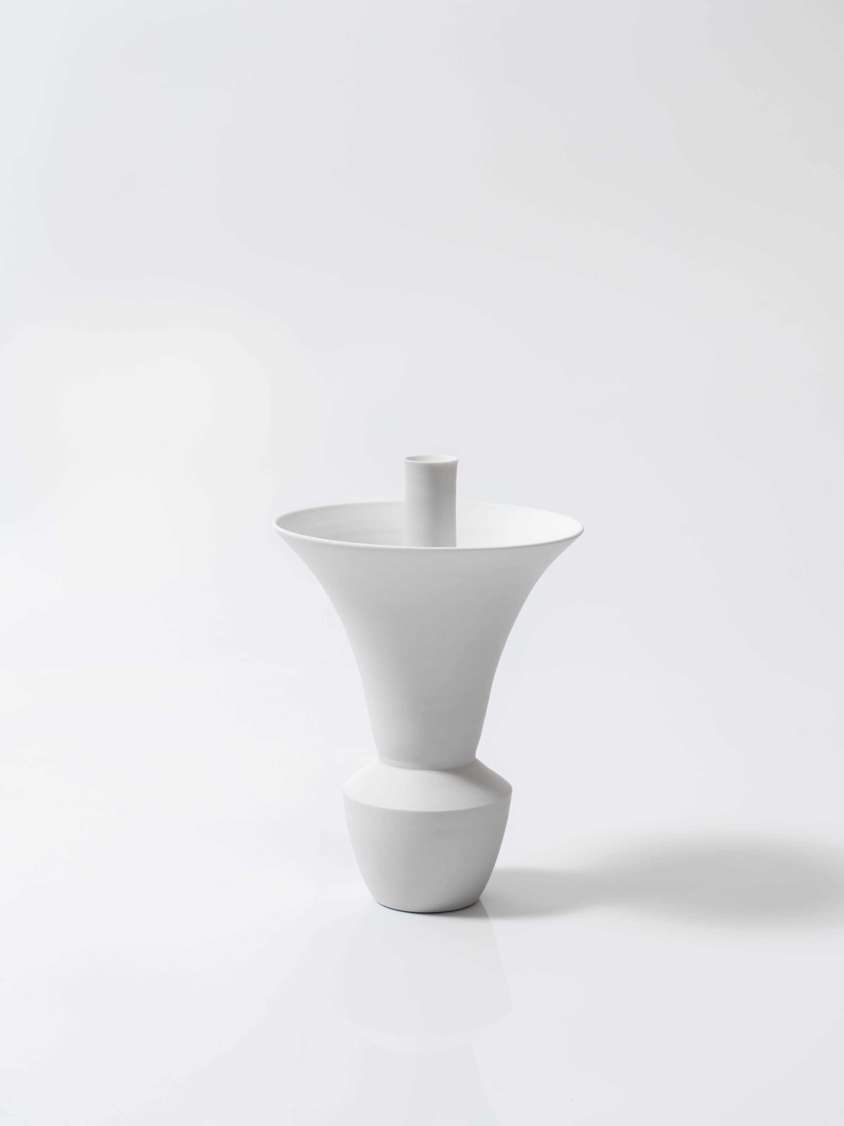 本作はその華瓶に着想を得たセラミックアートであり、花を生ける花器となっています。すっと伸びた口縁から胴へと広がる柔らかなラインは、花を迎え入れるための器としての寛容さを湛え、その下に据えられた台座はまるで根を張るように安定し、器全体に上昇と沈静が同時に宿る構造美を与えています。